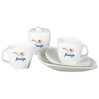 Talerz deserowy z nadrukiem Swing Coffee o średnicy 182 mm. Materiał wykonania to w stu procentach porcelana Royal. Nadruk wykonywany jest metodą nadruku bezpośredniego lub kalkomanii. Znakowanie może być wykonane aż do 6 kolorów! Realizujemy zamówienia już od 24 sztuk.